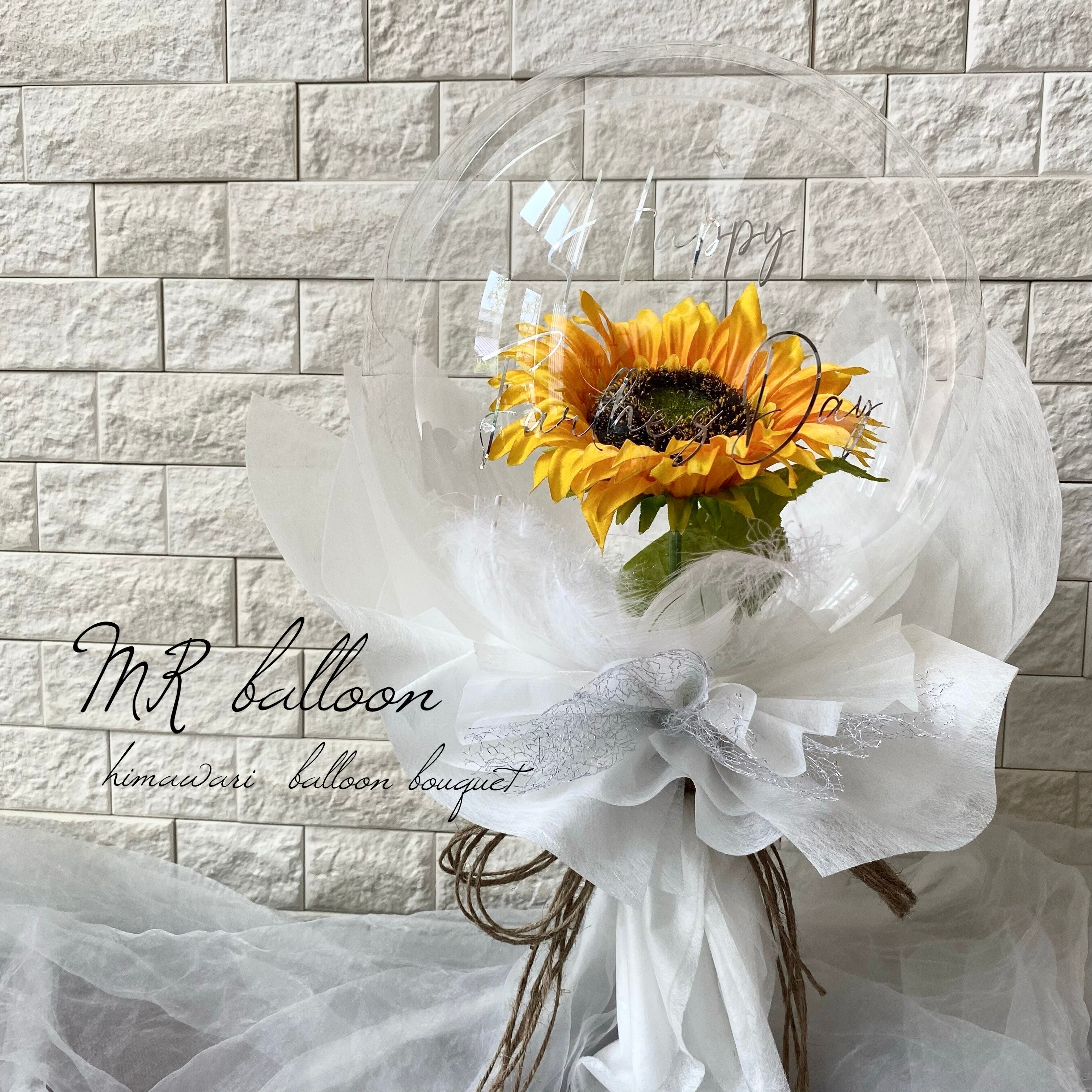 ふわふわラッピングのひまわり入りバルーンブーケ。