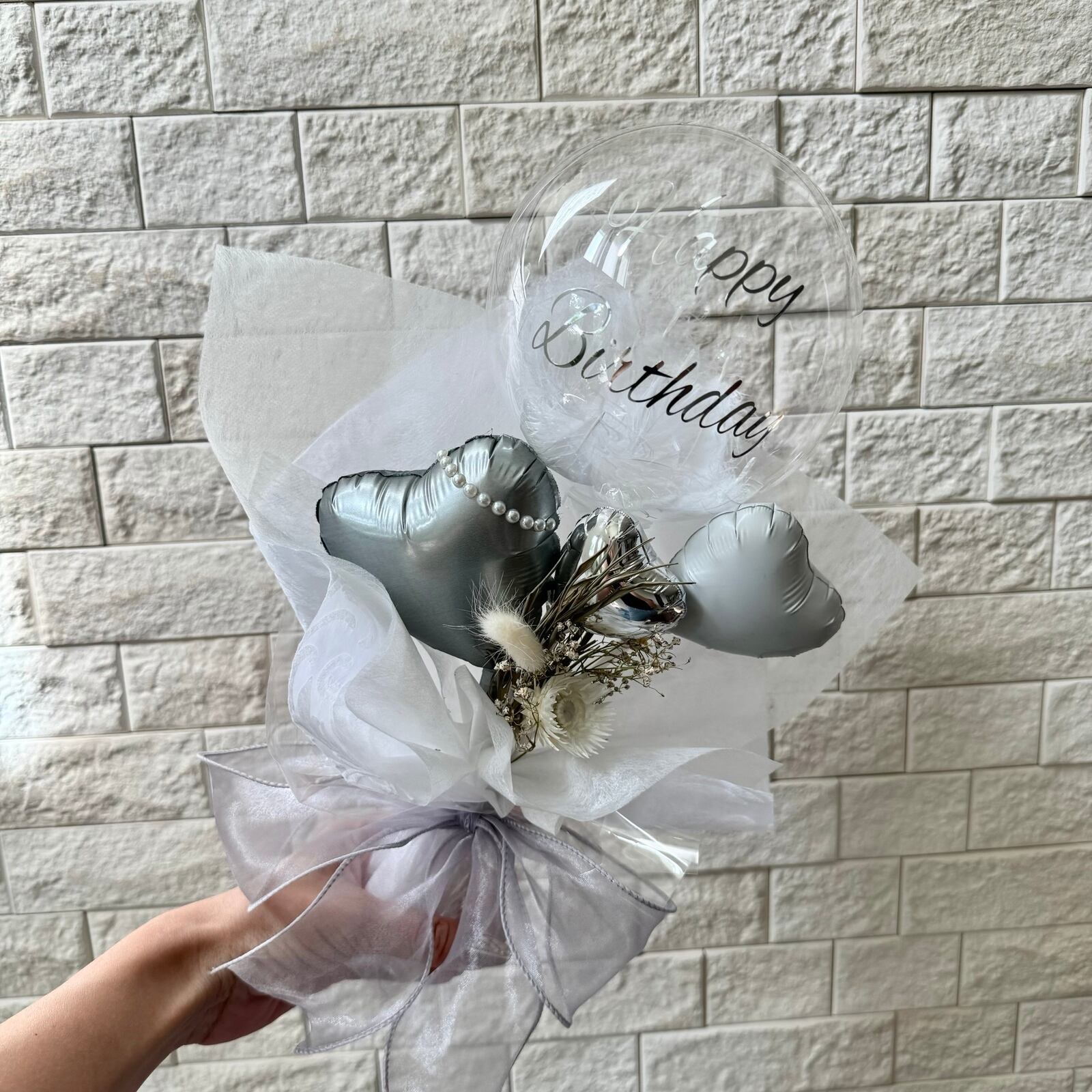 大人っぽいサテンのハートバルーンが入ったエレガントなミニバルーンブーケになります。